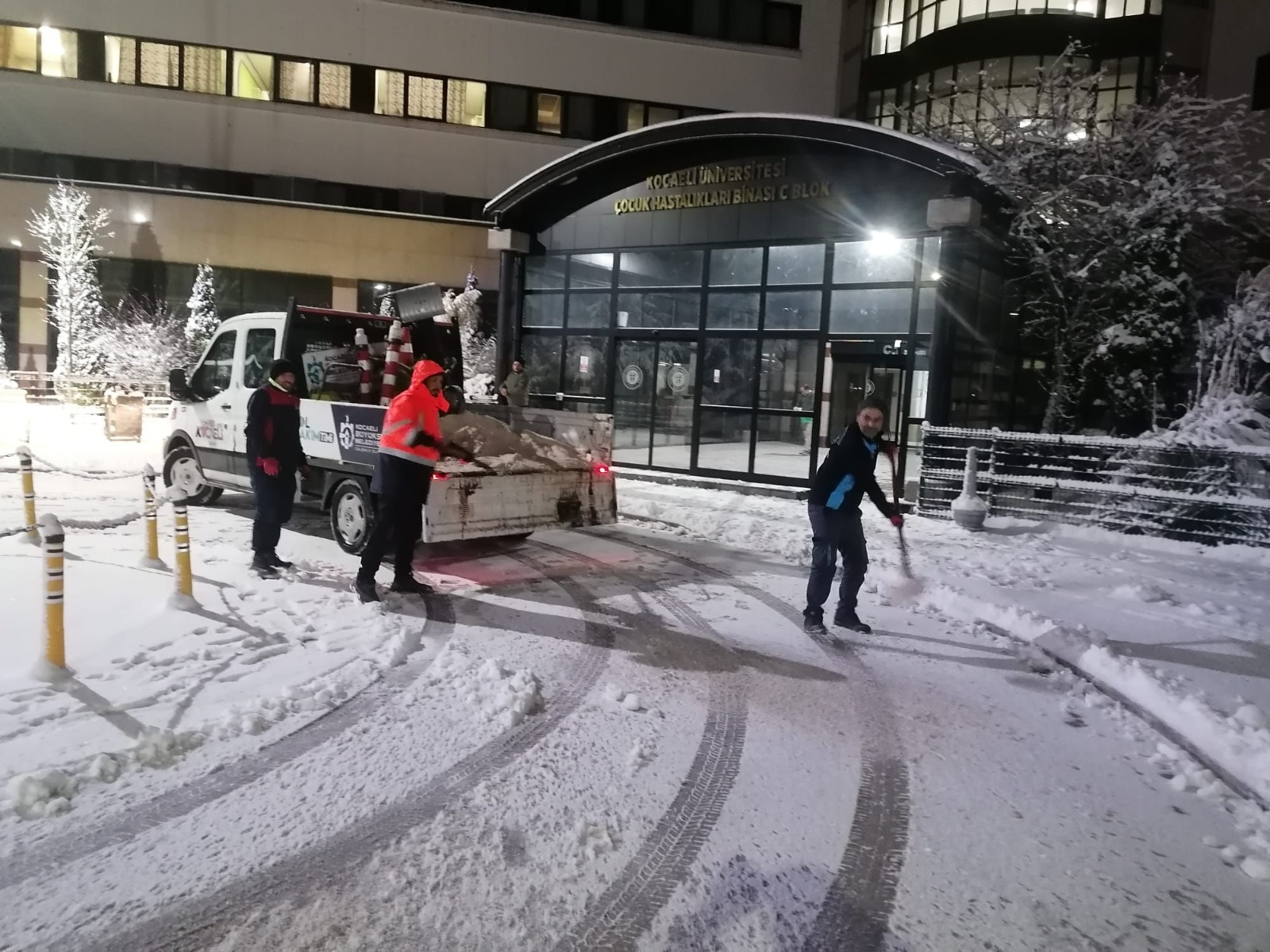 Bu kapsamda Umuttepe Kocaeli Üniversitesi Hastanesi çevresindeki yol ve kaldırımlar ile poliklinik ve acil servis girişlerinde kar temizliği aralıksız devam ediyor. Hastane ana girişleri, durak çevreleri ve yaya geçiş güzergâhlarında yapılan çalışmalarla yaya ve araç trafiğinin güvenli şekilde sürdürülmesi sağlanıyor.