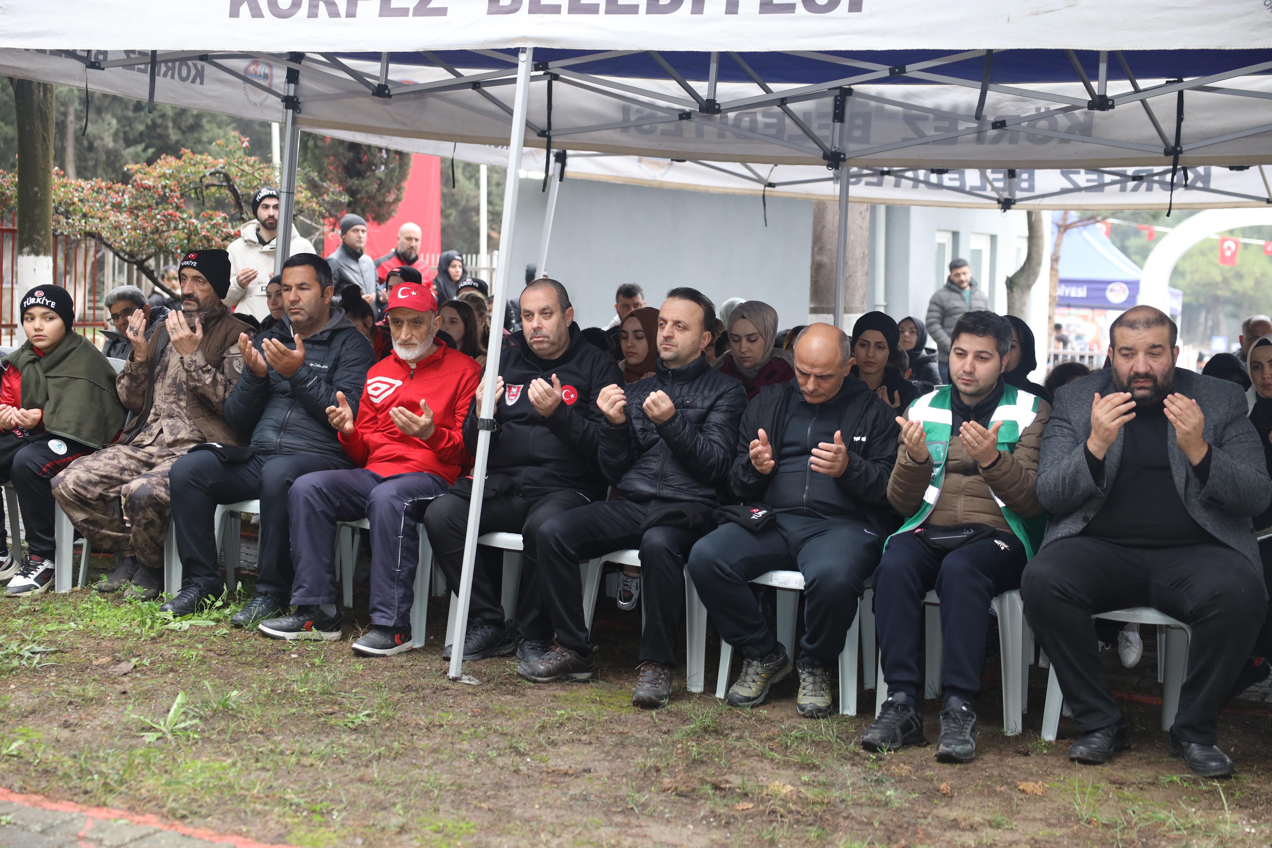Körfez Şehitliği’nde sona eren yürüyüş sonrasında şehitlerimiz için Kur’an-ı Kerim tilavetinde