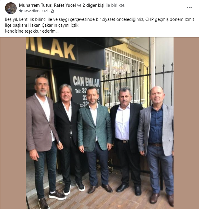 CHP İzmit İlçe önceki dönem Başkanı Hakan Çakar’ı ziyaret Eden Muharrem Tutuş, bu ziyareti şu sözlerle duyurdu ”Beş yıl, kentlilik bilinci ile ve saygı çerçevesinde bir siyaset öncelediğimiz, CHP geçmiş dönem İzmit ilçe başkanı Hakan Çakar'ın çayını içtik.Kendisine teşekkür ederim...”