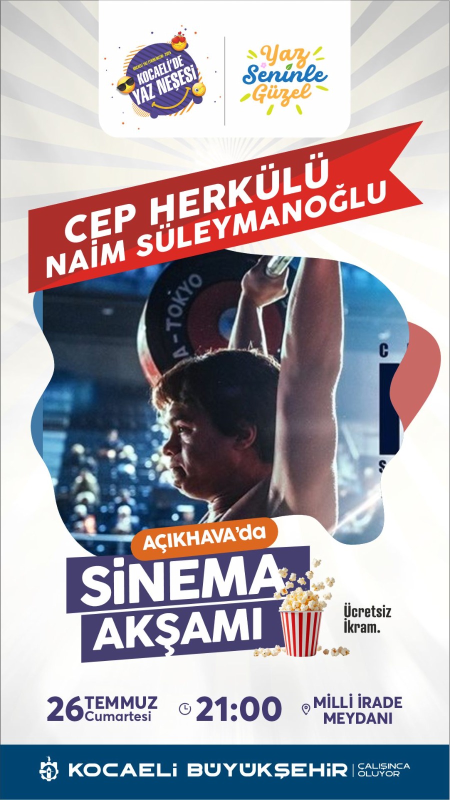 Büyükşehir Belediyesi, “Açık Havada Sinema Keyfi” ile yaz akşamlarına renk katacak. İzmit Milli İrade Meydanı’nda gerçekleştirilecek yerli sinema gösterimleri Cumartesi günü saat 21.00’de “Cep Herkülü Naim Süleymanoğlu” ile başlayacak.