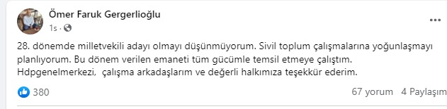HDP Kocaeli Milletvekili Ömer Faruk Gergerlioğlu sosyal medya hesabı üzerinden Milletvekilliği aday adaylığı için bir açıklamada bulundu. Aday olmayacağını açıklayan Gergerlioğlu “28. dönemde milletvekili adayı olmayı düşünmüyorum. Sivil toplum çalışmalarına yoğunlaşmayı planlıyorum. Bu dönem verilen emaneti tüm gücümle temsil etmeye çalıştım.Hdpgenelmerkezi, çalışma arkadaşlarım ve değerli halkımıza teşekkür ederim.” Dedi.