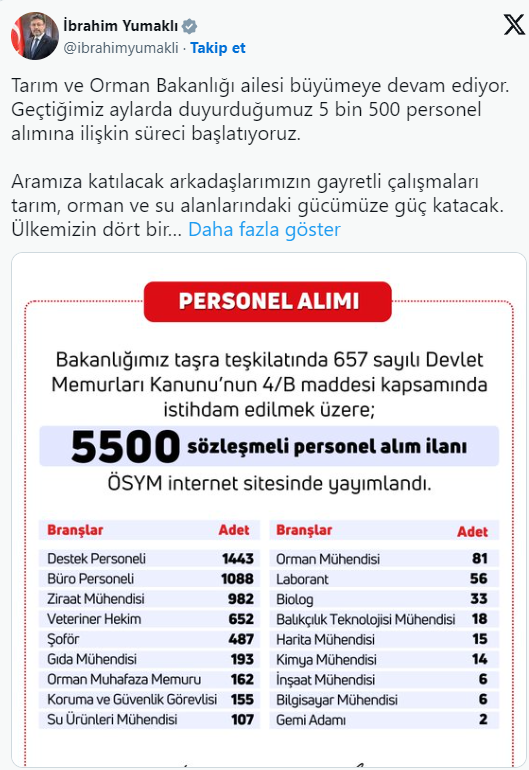Tarım ve Orman Bakanı İbrahim Yumaklı, bakanlığın taşra teşkilatlarında istihdam edilmek üzere yapılacak 5 bin 500 personel alımına ilişkin sürecin başlatıldığını duyurdu.