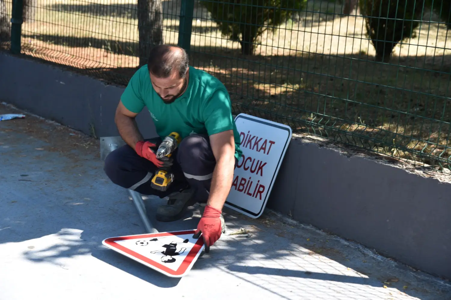 Çocuk parkı alanlarına yakın bölgelerde ve park alanlarında araç trafiğinin yavaşlatılması ve sürücülerin daha dikkatli hareket etmesi amacıyla Park ve Bahçeler Müdürlüğü ekiplerince monte edilen uyarı levhalarıyla, çocuklarımızın oyun oynarken daha güvenli bir ortamda vakit geçirmeleri sağlanacak. Bu çalışmalarla ilçede hem trafik güvenliğine katkı sağlıyor hem de geleceğimizin teminatı olan çocuklarımızın korunmasına yönelik adımlar atılıyor.