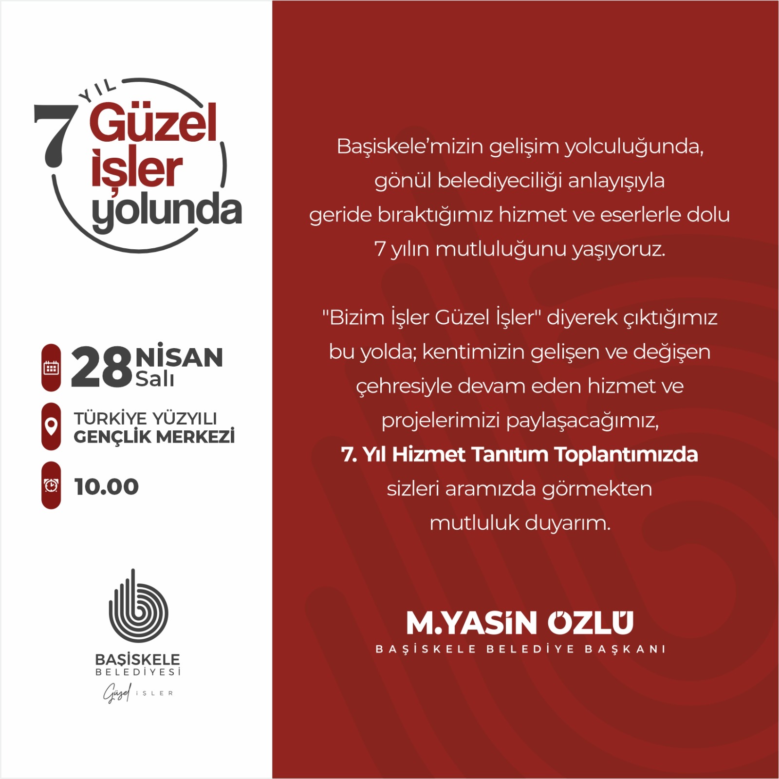 "Başiskele’mizin gelişim yolculuğunda, gönül belediyeciliği anlayışıyla geride bıraktığımız hizmet ve eserlerle dolu 7 yılın mutluluğunu yaşıyoruz. 'Bizim İşler Güzel İşler' diyerek çıktığımız bu yolda; kentimizin gelişen ve değişen çehresiyle devam eden hizmet ve projelerimizi paylaşacağımız 7. Yıl Hizmet Tanıtım Toplantımızda sizleri de aramızda görmekten mutluluk duyarım." ifadelerini kullandı.