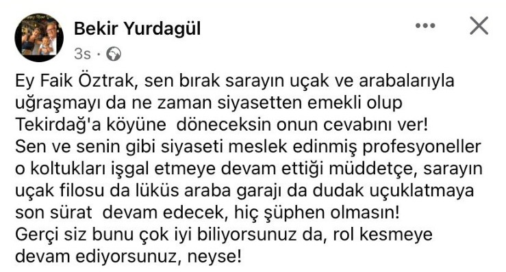 Seçim sonrası CHP’de sular durulmuyor. Kılıçdaroğlu’nun istifasının istendiği ve değişimin açıkça konuşulduğu şu günlerde CHP’li isimler de yaptıkları açıklamalar ile isyan etmeye devam ediyor. O isimlerden birisi de CHP Kocaeli eski Milletvekili Bekir Yurdagül. Sık sık yaptığı paylaşımlarla CHP’li isimleri ve CHP içerisindeki yönetim şeklini eleştiren Yurdagül bu kez de CHP Sözcüsü Faik Öztrak’a seslenerek” Ey Faik Öztrak, sen bırak sarayın uçak ve arabalarıyla uğraşmayı da ne zaman siyasetten emekli olup Tekirdağ'a köyüne döneceksin onun cevabını ver!” dedi.