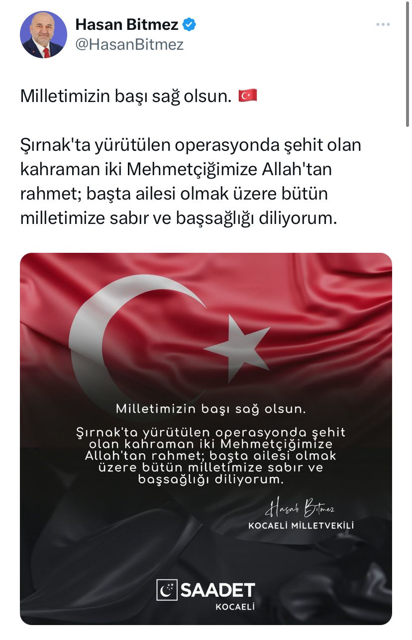 CHP kontenjanından listeye giren ve CHP Kocaeli Milletvekili seçilen Saadet Partisi Genel Başkan Hasan Bitmez, sosyal medya hesabı üzerinden şehitlerimiz için taziye mesajı yayımladı. O mesaja vatandaşlardan tepki yağdı.