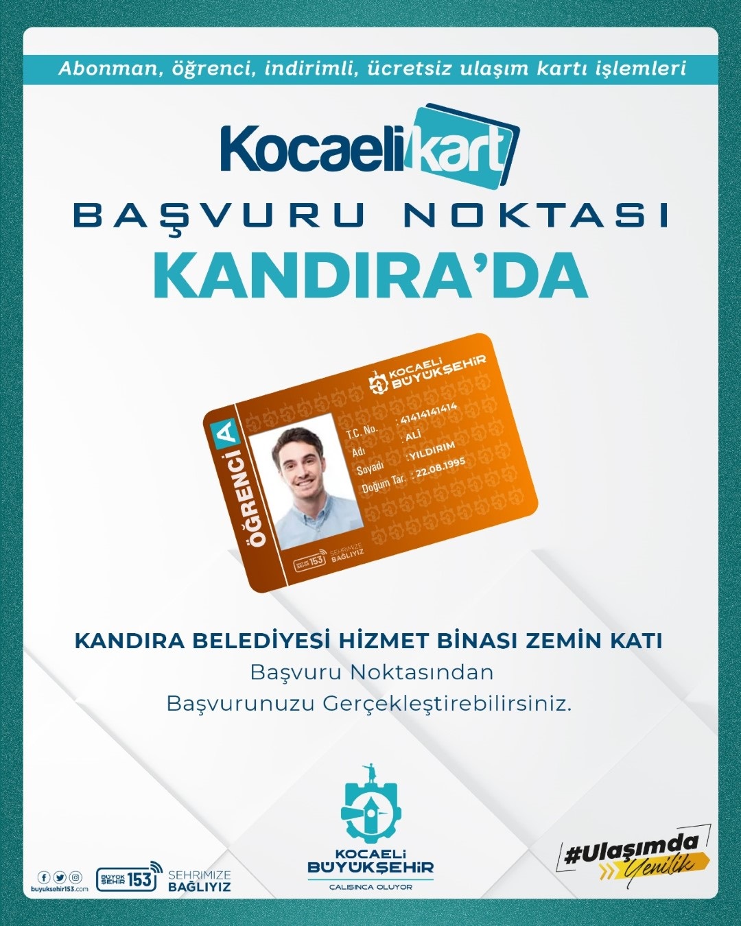 Vatandaşların her alanda hayatını kolaylaştırmak için yoğun çaba gösteren Kocaeli Büyükşehir Belediyesi, ulaşımda artan “Kocaelikart” taleplerine kalıcı çözümler getiriyor. Bu bağlamda yerinde hizmeti amaçlayan Ulaşım Dairesi Başkanlığı, seyahat kartları ofislerinin bir yenisini Kandıra ilçesinde ekledi. Kandıra Belediyesi Hizmet Binası zemin katında kurulan seyahat kartları ofisi 27 Aralık Çarşamba günü (yarın) itibariyle 08.30-17.30 saatleri arasında hizmet vermeye başlayacak.