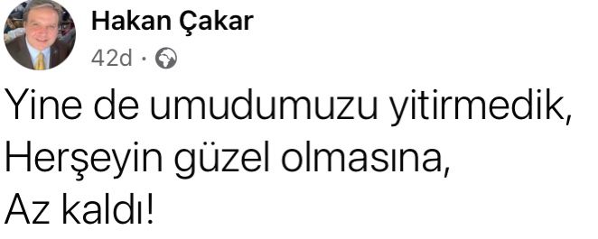 Seçimlerde büyük bir hezimet yaşayan CHP’de şu sıralar hareketli günler yaşanıyor. Değişim sancılarının yaşandığı CHP’de Kılıçdaroğlu’nun istifası istenirken Genel Başkanlık için ismi geçen İBB Başkanı Ekrem İmamoğlu’da değişim istediğini açıkça ifade etmişti . Yine TBMM Grup Başkanvekili Özgür Özel de başkanlığa aday olduğunu duyurmuştu. Parti içinde yaşanan bu kargaşalar hem siyasileri hem de partilileri oyundan düşürmüş ve moral bozukluğuna sevk etmişken CHP İzmit İlçe eski Başkanı ve Milletvekili aday adayı Hakan Çakar, sosyal medya hesabı üzerinden yaptığı paylaşımla "Yine de umudumuzu yitirmedik, Herşeyin güzel olmasına, Az kaldı!” dedi. Çakar’ın bu paylaşımına yorum yazan bazı vatandaşlar ise “Sen nerde yaşıyorsun başkan bunun hakkında kimse çalışma yapmıyor yapanlarda kendi çıkarları peşinde ölmüşüzde ağlayanımız yok”, “Bişey olacağı yok adaş artık kendimizi kandirmayı bırakalım umut sadece işkenceyi uzatıyor” gibi yorumlarla tepki gösterdi.