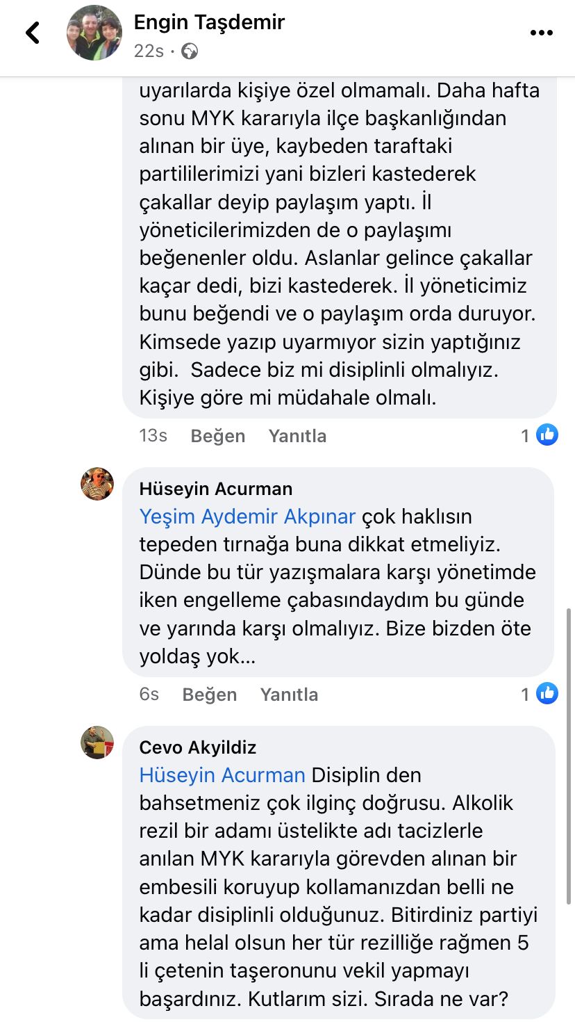 Acurman’ın yorumuna CHP Derince eski İlçe Başkanı Birkan Koçak hakkındaki taciz iddialarını dile getirdiği için disipline verilen Cevahir Akyıldız tepkili bir şekilde cevap verdi.Akyıldız verdiği cevabında : “Disiplin den bahsetmeniz çok ilginç doğrusu. Alkolik rezil bir adamı üstelikte adı tacizlerle anılan MYK kararıyla görevden alınan bir embesili koruyup kollamanızdan belli ne kadar disiplinli olduğunuz. Bitirdiniz partiyi ama helal olsun her tür rezilliğe rağmen 5 li çetenin taşeronunu vekil yapmayı başardınız. Kutlarım sizi. Sırada ne var?” dedi