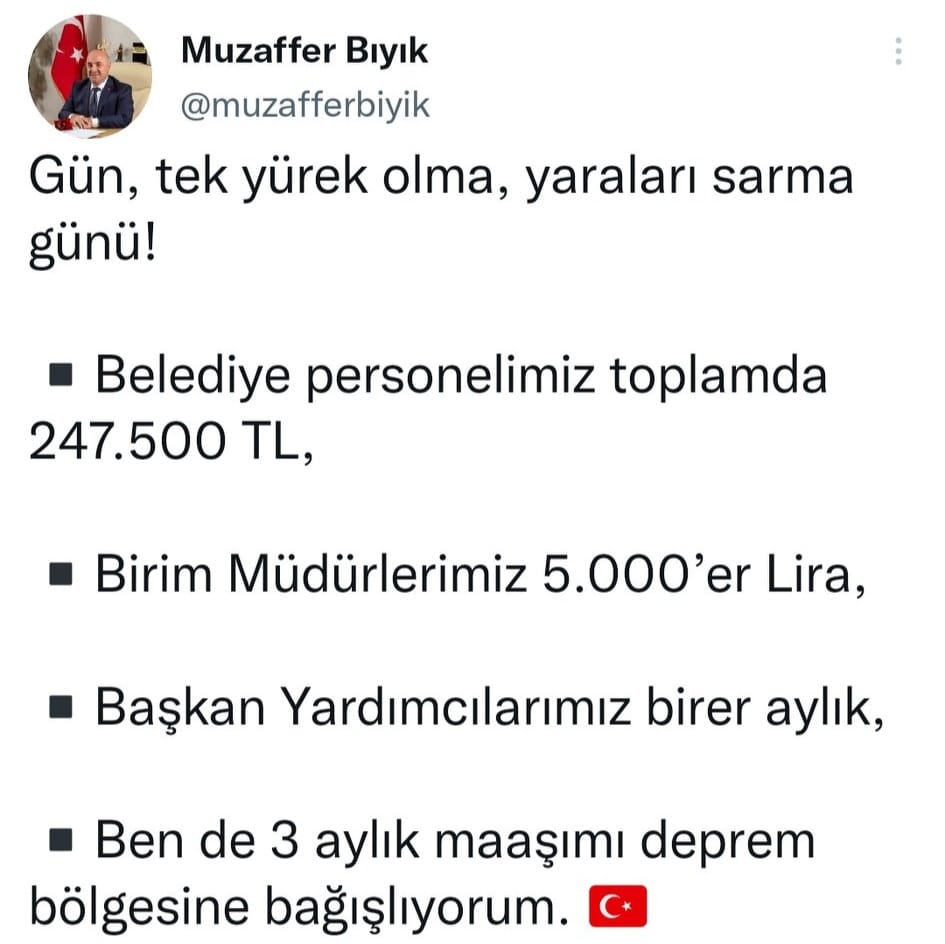 Kahramanmaraş merkezli iki deprem sonrası10 ilde yıkım meydana geldi. Asrın felaketini yaşadığımız bu zor günlerde ise depremzedelerin yaralarını sarabilmek için yardım seferberliği başlatıldı. Bu kapsamda Darıca Belediyesinde Belediye Başkanı Muzaffer Bıyık, 3 aylık maaşını bağışlarken, belediye personeli toplamda 247.500 TL, birim müdürleri 5.000’er lira ve başkan yardımcıları birer aylık maaşlarını depremzedelere bağışladıkları açıkladı.