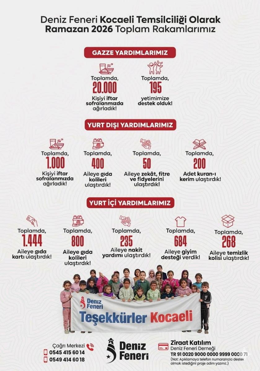 Deniz Feneri Derneği Kocaeli Temsilciliği, bölgeden yapılan bağışlarla hem Türkiye’de hem Gazze’de hem de Afrika’da önemli çalışmalara imza attı. Kocaeli’de Ramazan boyunca: