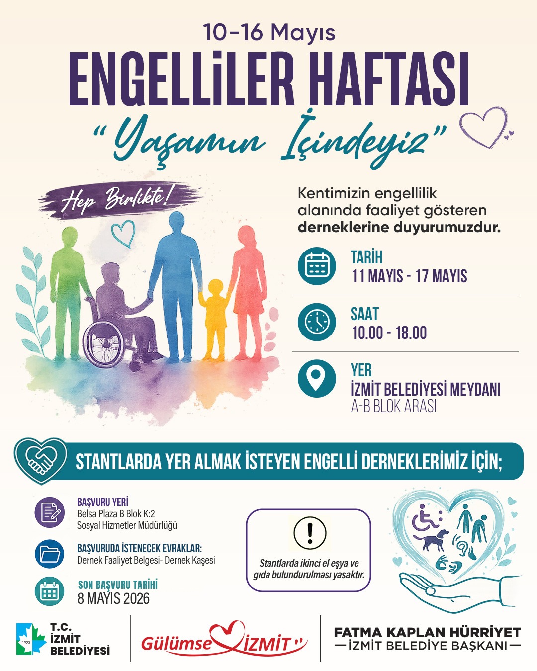 İzmit Belediyesi Sosyal Hizmetler Müdürlüğü, 10–16 Mayıs Engelliler Haftası kapsamında anlamlı bir etkinliğe ev sahipliği yapacak. “Yaşamın İçindeyiz” sloganıyla düzenlenecek organizasyonda, kentte faaliyet gösteren engelli dernekleri bir araya gelerek hem farkındalık oluşturacak hem de el emeği ürünlerini vatandaşlarla buluşturacak.