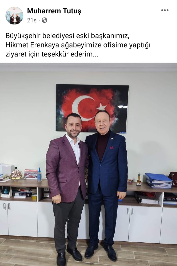 AK Parti İzmit İlçe Başkanlığına atanan ve parti tabanında büyük memnuniyetle karşılana Muharrem Tutuş hayırlı olsun ziyaretlerini kabul etmeye devam ediyor. CHP’li pek çok ismin de atama sonrası ziyaret ettiği Tutuş’u bu kez Eski Saraybahçe ve İzmit Belediye Başkanı,CHP eski dönem milletvekili Hikmet Erenkaya ziyaret ederek hayırlı olsun dileklerini iletti. Ziyaret sonrası sosyal medya hesabından paylaşımda bulunan Tutuş, şu ifadelere yer verdi;” Büyükşehir belediyesi eski başkanımız, Hikmet Erenkaya ağabeyimize ofisime yaptığı ziyaret için teşekkür ederim...”
