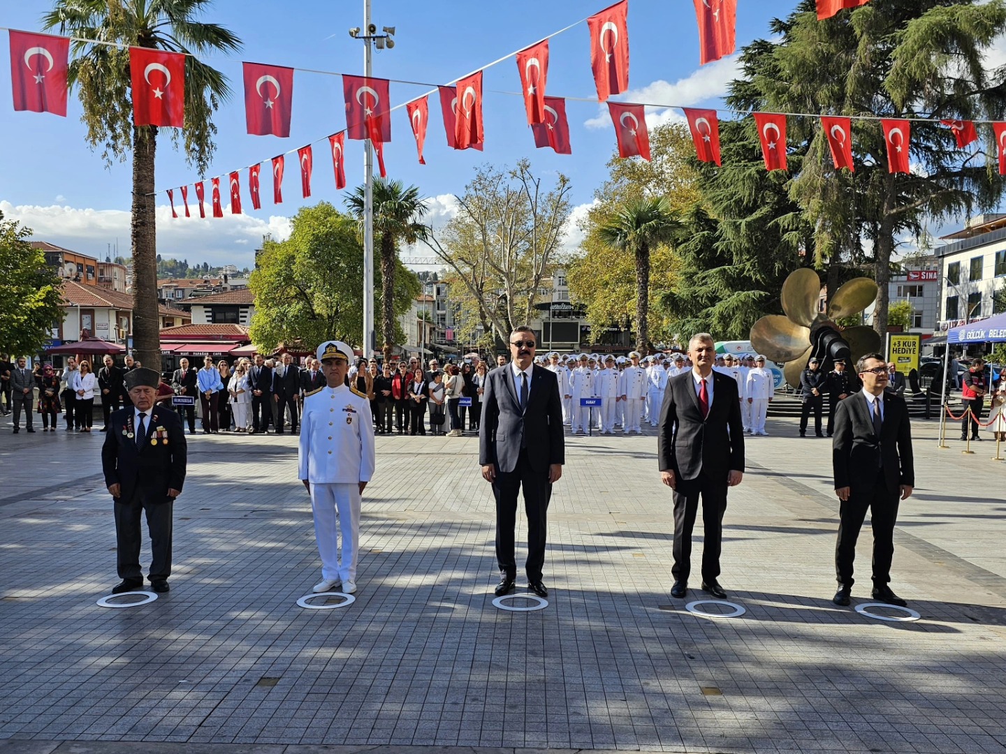 Tören; Gölcük Kaymakamı Müfit Gültekin, Gölcük Deniz Ana Üs ve Garnizon Komutanı Tuğamiral Mehmet Özgür Özömek, Gölcük Belediye Başkanı Ali Yıldırım Sezer, Türkiye Muharip Gâziler Derneği Gölcük Şubesi Başkanı Mehmet Arslan’ın Atatürk Anıtına çelenk sunumları ile başladı. Törende daha sonra saygı duruşu ve akabinde de; İstiklal Marşı’nın okunması sonrasında günün anlam ve önemini belirten konuşmalar yapıldı.