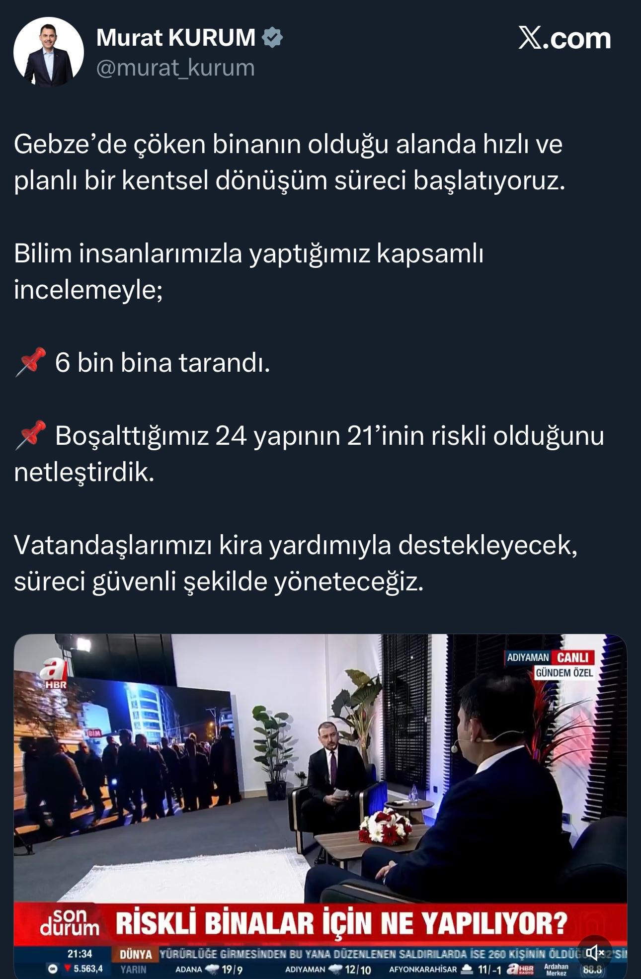 29 Ekim’de Gebze’de çöken binanın ardından bölgede yapılan taramalarda 24 binadan 21’i riskli çıktı. Çökme sonrası başlatılan incelemeler neticesinde Bakan Murat Kurum, kapsamlı bir kentsel dönüşüm sürecinin başlayacağını ve vatandaşlara kira yardımı yapılacağını duyurdu.