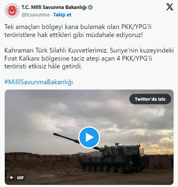 Milli Savunma Bakanlığı'ndan yapılan açıklamada, "Tek amaçları bölgeyi kana bulamak olan PKK/YPG’li teröristlere hak ettikleri gibi müdahale ediyoruz. Kahraman Türk Silahlı Kuvvetlerimiz, Suriye’nin kuzeyindeki Fırat Kalkanı bölgesine taciz ateşi açan 4 PKK/YPG’li teröristi etkisiz hâle getirdi." denildi.