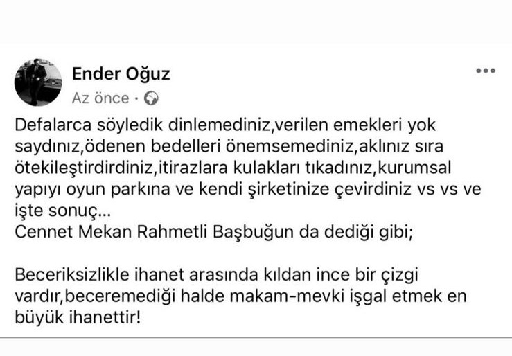 İYİ Parti Körfez Belediyesi Meclis Üyesi Ender Oğuz’da yaptığı paylaşımla Kılıçdaroğlu’nun adaylığını hedef alarak şu ifadelere yer verdi;“Defalarca söyledik dinlemediniz,verilen emekleri yok saydınız,ödenen bedelleri önemsemediniz,aklınız sıra ötekileştirdirdiniz,itirazlara kulakları tıkadınız,kurumsal yapıyı oyun parkına ve kendi şirketinize çevirdiniz vs vs ve işte sonuç… Cennet Mekan Rahmetli Başbuğun da dediği gibi; Beceriksizlikle ihanet arasında kıldan ince bir çizgi vardır,beceremediği halde makam-mevki işgal etmek en büyük ihanettir!”