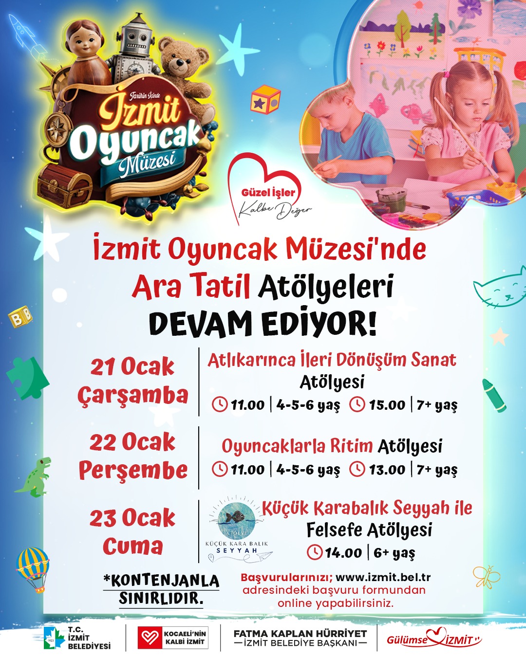 İzmit Belediyesi Oyuncak Müzesi, ara tatil döneminde çocuklar için hazırladığı atölye programıyla kapılarını yaratıcılığa açıyor. 21–25 Ocak tarihleri arasında gerçekleştirilecek etkinliklerde çocuklar; sanat, müzik, felsefe ve el becerilerini geliştirecek atölyelerle dolu dolu bir tatil geçirme imkânı bulacak.
