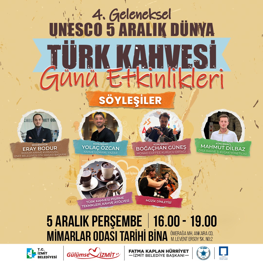 Türk kahvesinin 2013 yılında UNESCO tarafından “Somut Olmayan Kültürel Miras” listesine alınmasıyla, her yıl 5 Aralık günü tüm dünyada “Dünya Türk Kahvesi Günü” olarak kutlanıyor. Bu yıl İzmit Belediyesi, bu anlamlı günü 4. kez kutlayamaya hazırlanıyor. Türk kahvesi, Osmanlı döneminden günümüze kadar sadece bir içecek değil, aynı zamanda kendine özgü bir kültür taşıyor. Bu kültürü yaşatmak ve yeni nesillere aktarmak amacıyla düzenlenen etkinlik, kahve severleri geçmişle gelecek arasında keyifli bir yolculuğa çıkaracak.