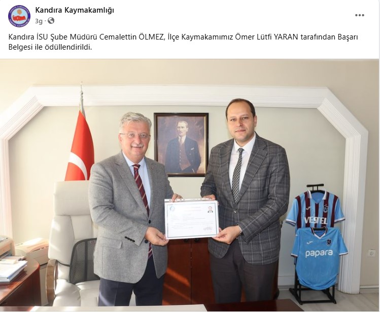 Kandıra İSU Şube Müdürü Cemalettin ÖLMEZ, İlçe Kaymakamı Ömer Lütfi YARAN tarafından Başarı Belgesi ile ödüllendirildi.