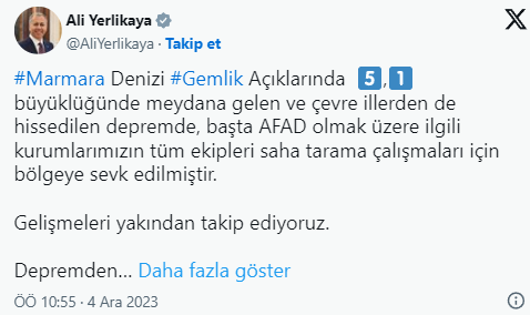 İçişleri Bakanı Ali Yerlikaya, "Marmara Denizi #Gemlik Açıklarında 5,1 büyüklüğünde meydana gelen ve çevre illerden de hissedilen depremde, başta AFAD olmak üzere ilgili kurumlarımızın tüm ekipleri saha tarama çalışmaları için bölgeye sevk edilmiştir. " dedi.