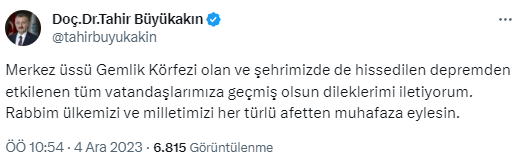 Kocaeli Büyükşehir Belediye Başkanı Tahir Büyükakın, "Merkez üssü Gemlik Körfezi olan ve şehrimizde de hissedilen depremden etkilenen tüm vatandaşlarımıza geçmiş olsun dileklerimi iletiyorum. Rabbim ülkemizi ve milletimizi her türlü afetten muhafaza eylesin.. " dedi.