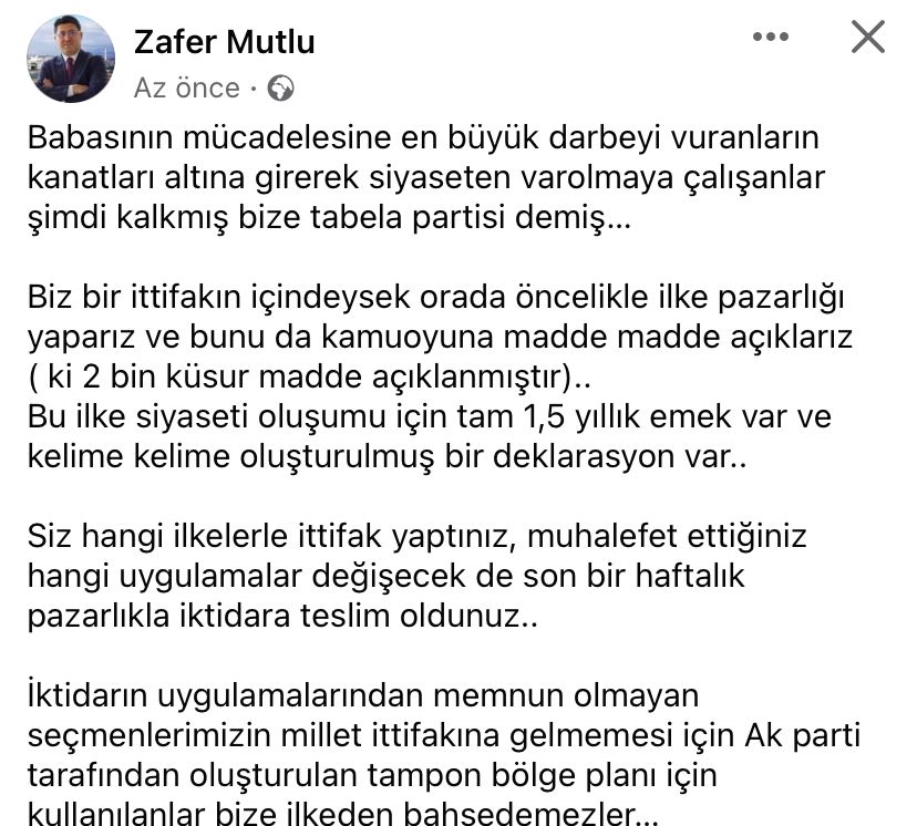 Siz hangi ilkelerle ittifak yaptınız, muhalefet ettiğiniz hangi uygulamalar değişecek de son bir haftalık pazarlıkla iktidara teslim oldunuz..İktidarın uygulamalarından memnun olmayan seçmenlerimizin millet ittifakına gelmemesi için Ak parti tarafından oluşturulan tampon bölge planı için kullanılanlar bize ilkeden bahsedemezler…”