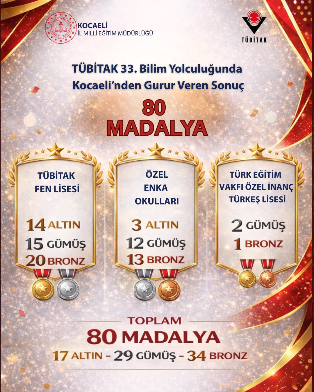 TÜBİTAK Fen Lisesi: 14 Altın, 15 Gümüş, 20 Bronz – Toplam 49 Madalya