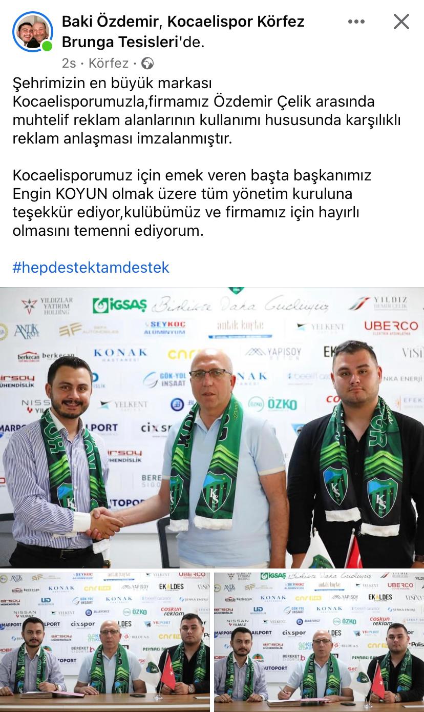 Reklam anlaşmasını sosyal medya hesabı üzerinden duyuran Özdemir şu ifadelere yer verdi;” Şehrimizin en büyük markası Kocaelisporumuzla,firmamız Özdemir Çelik arasında muhtelif reklam alanlarının kullanımı hususunda karşılıklı reklam anlaşması imzalanmıştır. Kocaelisporumuz için emek veren başta başkanımız Engin KOYUN olmak üzere tüm yönetim kuruluna teşekkür ediyor,kulübümüz ve firmamız için hayırlı olmasını temenni ediyorum.” Dedi.