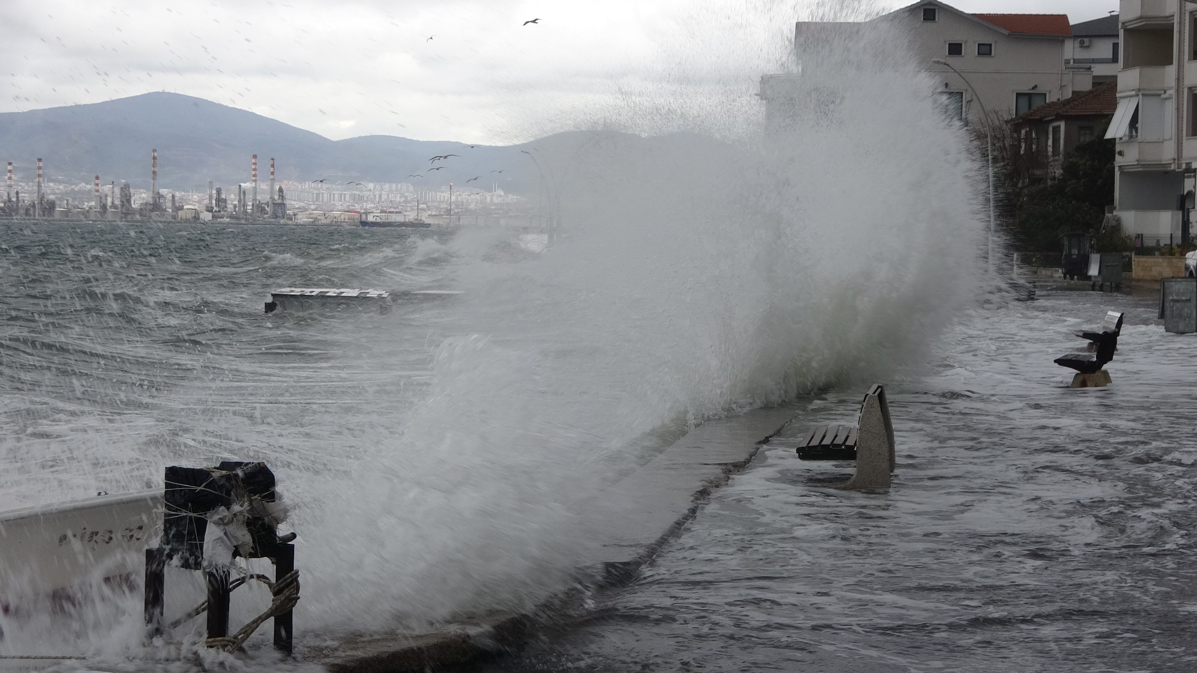 Kocaeli'nin Gölcük ve Başiskele ilçelerinde sabah saatlerinde etkili olan lodos nedeniyle dalgalar metrelerce yüksekliğe ulaştı. Deniz taşınca bazı yollar göle döndü.