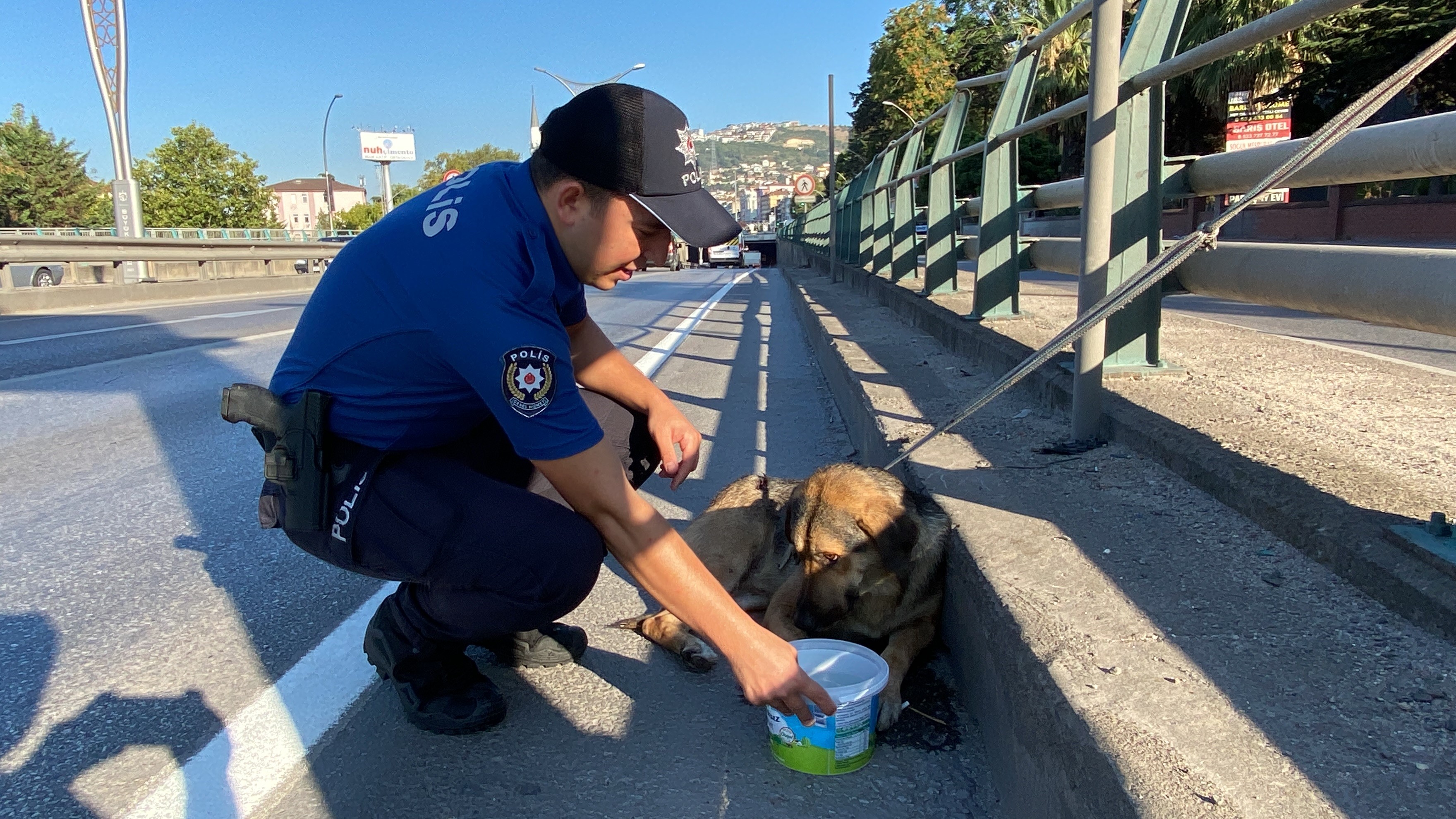 Olay, saat 07.30 sıralarında D-100 kara yolu İstanbul istikameti Kozluk Mahallesi mevkisinde meydana geldi. Yaralı bir köpeğin yol kenarındaki demir korkuluklara bağlandığını gören vatandaşların ihbarı üzerine adrese polis ekipleri sevk edildi. Polis ekipleri yol kenarına duba koydu. Trafik ekipleri de muhtemel kazanın önüne geçmek için yolda önlem aldı. Aynı zamanda konu, İzmit Belediyesi Veteriner Hizmetleri Müdürlüğüne bildirildi. Polis, belediye ekipleri ekipleri gelene kadar köpeğin yanından bir an olsun ayrılmadı. Kalça kısmında yara olan köpeğin yürüyemediği görüldü. Korku dolu gözlerle etrafına bakan köpeğe polis memuru elleriyle su içirdi, yüzünü yıkadı. Polisin ilgilendiği köpek, İzmit Belediyesi ekipleri tarafından yoldan alınarak, bakım ve tedavisi için barınağa götürüldü.