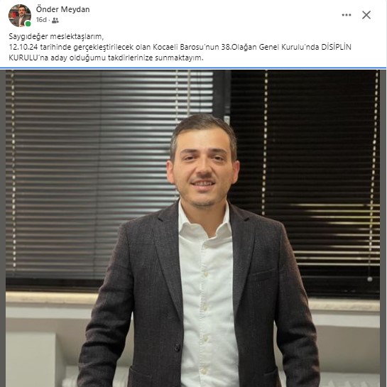 Avukat Önder Meydan, 12.10.24 Cumartesi günü gerçekleştirilecek olan Kocaeli Barosu’nun 38.Olağan Genel Kurulu’nda Disiplin Kurulu’na aday olduğumu açıklandı.