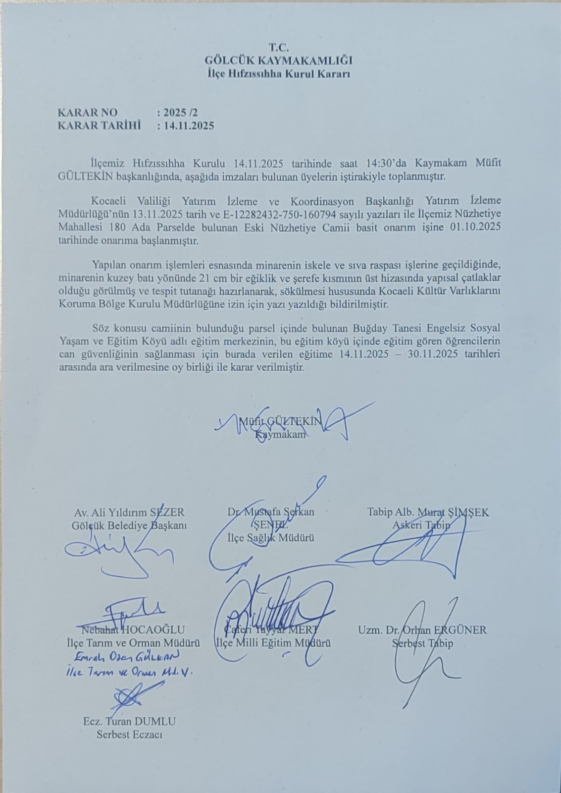 Gölcük’ün Nüzhetiye Mahallesi’nde faaliyet gösteren Buğday Tanesi Engelsiz Sosyal Yaşam ve Eğitim Köyü, bahçesinde yer alan Nüzhetiye Eski Cami’nin minaresinde tespit edilen 21 santimetrelik eğim sebebiyle geçici süreyle kapatıldı. Kocaeli Valiliği’nin onayı sonrası alınan kararla, kurumun eğitim ve bakım hizmetleri 30 Kasım 2025’e kadar durduruldu.