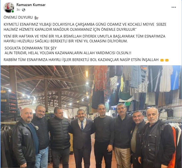 Kocaeli Seyyar Esnafı ve Pazarcılar Esnaf Odası Başkanı Ramazan Kumsar’dan yapılan açıklama şu şekilde: “Kıymetli esnafımız, Yılbaşı dolayısıyla çarşamba günü odamız ve Kocaeli Meyve Sebze Halimiz hizmete kapalı olacaktır. Mağduriyet yaşamamanız için önemle duyurulur. Yeni bir haftaya ve yeni bir yıla Bismillah diyerek umutla başlıyoruz. Tüm esnafımıza hayırlı, huzurlu, sağlıklı ve bereketli bir yeni yıl diliyorum. Soğukta donmayan tek şey alın teridir. Helal yoldan kazananların Allah yardımcısı olsun. Rabbim, tüm esnafımıza hayırlı işler, bereketli ve bol kazançlar nasip etsin inşallah.” Dedi.