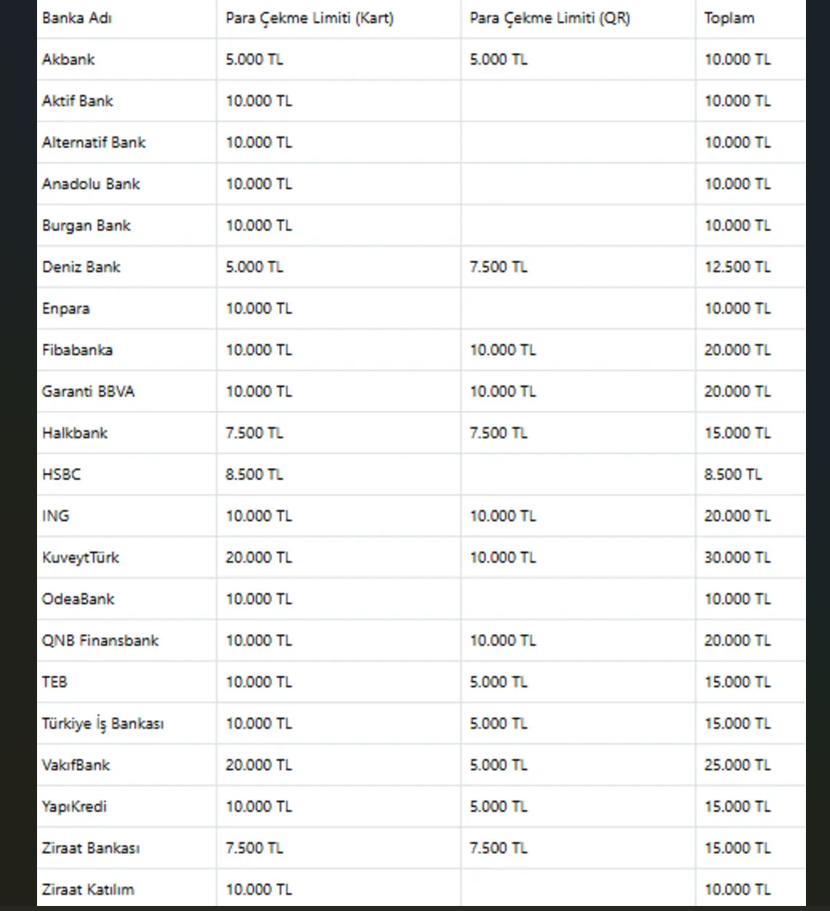 QR kodlu para çekme işlemlerinde yükselttiği limitlerle birlikte güncel tablo şu şekilde: