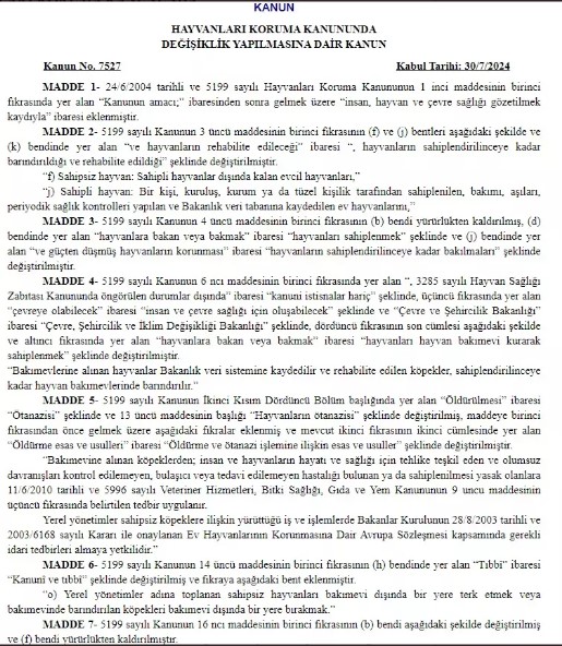 30 Temmuz'da TBMM Genel Kurulunda kabul edilen ve Cumhurbaşkanı Recep Tayyip Erdoğan tarafından onaylanan kanuna göre, sahipsiz hayvanlar, ilgili belediyeler tarafından hayvan bakımevine götürülecek, rehabilite edilen köpekler sahiplendirilinceye kadar bu yerlerde barındırılacak.İnsan ile hayvanların hayatı ve sağlığı için tehlike teşkil eden ve olumsuz davranışları kontrol edilemeyen, bulaşıcı veya tedavi edilemeyen hastalığı bulunan ya da sahiplenilmesi yasak olan hayvanlara, Veteriner Hizmetleri, Bitki Sağlığı, Gıda ve Yem Kanunu'nun 9. maddesindeki hükümler uygulanacak.