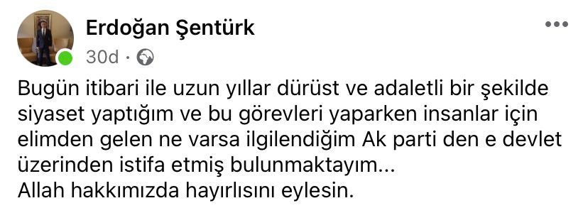 İzmit’in tanınmış simalarından, İzmit Belediyespor eski Kulüp Başkanı, AK Parti eski il ve İzmit ilçe yöneticisi, KOVİAD Genel Sekreteri, Eren İnşaat ve Gayrimenkul’ün sahibi Erdoğan Şentürk, sosyal medya hesabından yaptığı paylaşımla partiden istifa ettiğini duyurdu. Şentürk“Bugün itibari ile uzun yıllar dürüst ve adaletli bir şekilde siyaset yaptığım ve bu görevleri yaparken insanlar için elimden gelen ne varsa ilgilendiğim Ak parti den e devlet üzerinden istifa etmiş bulunmaktayım... Allah hakkımızda hayırlısını eylesin.” Dedi.