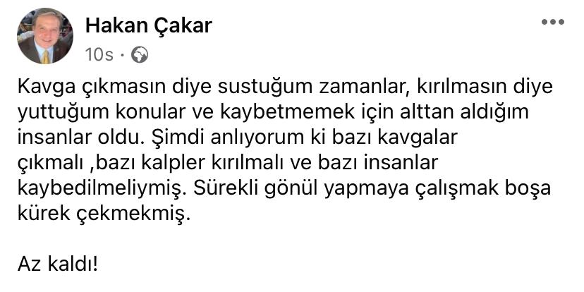 CHP İzmit İlçe eski Başkanı Hakan Çakar, sosyal medya hesabı üzerinden yaptığı art arda imalı paylaşımlar ile “Az kaldı” mesajı veriyor. Çakar’ın bu göndermeli paylaşımları ise kime yaptığı merak ediliyor.