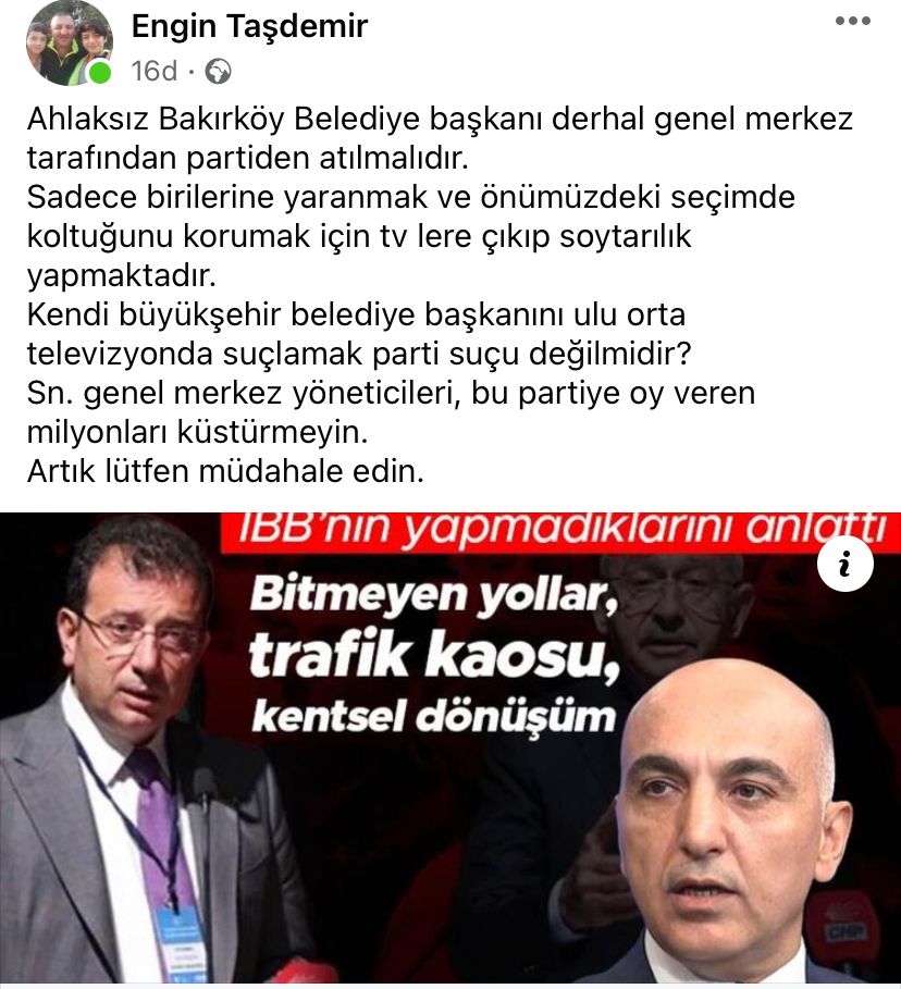 “Ahlaksız Bakırköy Belediye başkanı derhal genel merkez tarafından partiden atılmalıdır. Sadece birilerine yaranmak ve önümüzdeki seçimde koltuğunu korumak için tv lere çıkıp soytarılık yapmaktadır. Kendi büyükşehir belediye başkanını ulu orta televizyonda suçlamak parti suçu değilmidir? Sn. genel merkez yöneticileri, bu partiye oy veren milyonları küstürmeyin. Artık lütfen müdahale edin.”