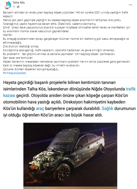 “Bariyerin altından bir anda çıkan başıboş köpek yüzünden 140 km süratle 2021 yılında yaptığım trafik kazası!!! Henüz çok yakın geçmişte yaptığım bu kazada başıboş köpek anormalinin tartışması bile yoktu. Tutanağımızı yaptık, hayatımıza devam ettik. Ölebilirdik, vademiz dolmamış. Şimdi ‘’pireyi deve yapıyorsunuz diye bizi suçlayan müptezel zihniyetler kendi heves ve menfaatleri için bu anormalin normal olarak kabulünün gayretindeler. HAYIR!!