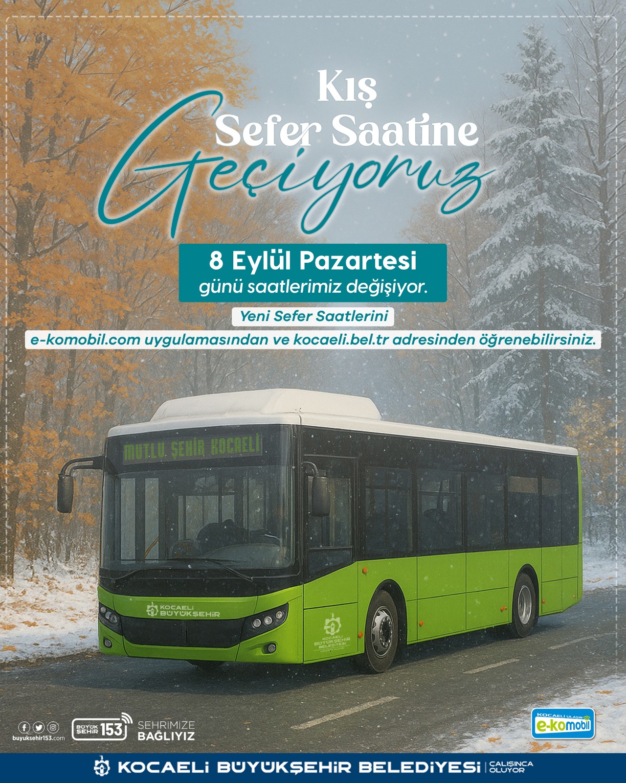 Kocaeli Büyükşehir Belediyesi, 8 Eylül Pazartesi günü (yarın) itibarıyla otobüs ve tramvaylarda kış sefer saatleri uygulamasına geçiyor. Yapılan düzenlemelere www.kocaeli.bel.tr/hatlar/adresinden ve e-Kocaeli mobil uygulamasından ulaşılabiliyor.