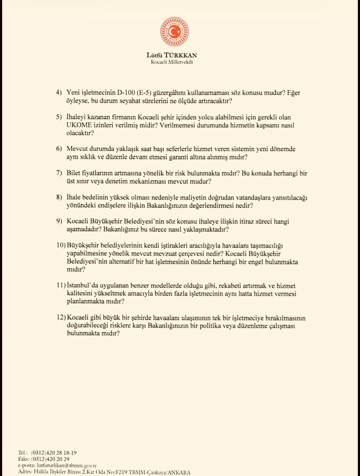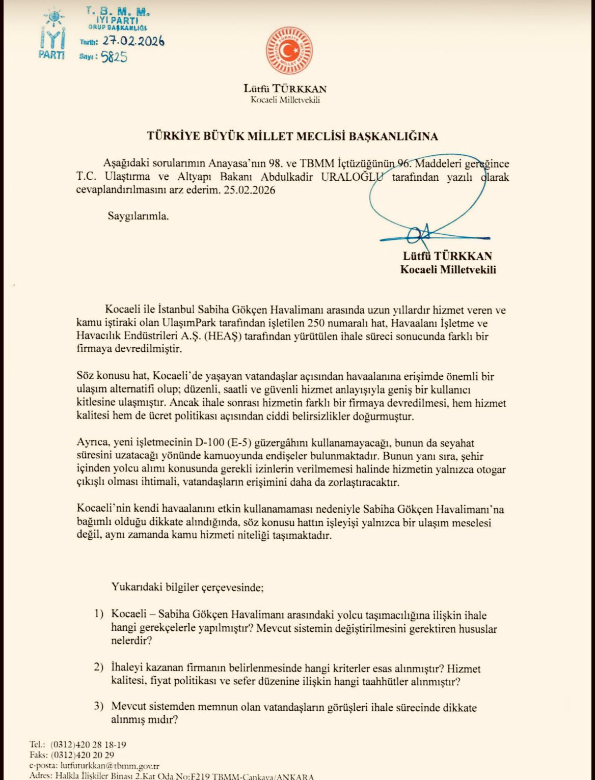 İYİ Parti Kocaeli Milletvekili Türkkan, yıllardır Kocaeli halkının yoğun olarak kullandığı ve UlaşımPark tarafından işletilen 250 numaralı havalimanı hattının yapılan ihale sonucunda farklı bir firmaya devredildiğini hatırlattı. Türkkan, önergesini Murat Kurum’un yanıtlaması istemiyle Türkiye Büyük Millet Meclisi Başkanlığı’na sundu.