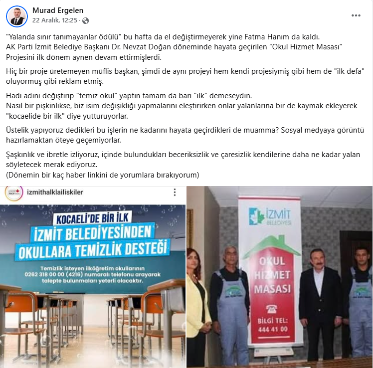 Ergelen’in paylaşımı şu şekilde : "Yalanda sınır tanımayanlar ödülü" bu hafta da el değiştirmeyerek yine Fatma Hanım da kaldı. AK Parti İzmit Belediye Başkanı Dr. Nevzat Doğan döneminde hayata geçirilen “Okul Hizmet Masası” Projesini ilk dönem aynen devam ettirmişlerdi.