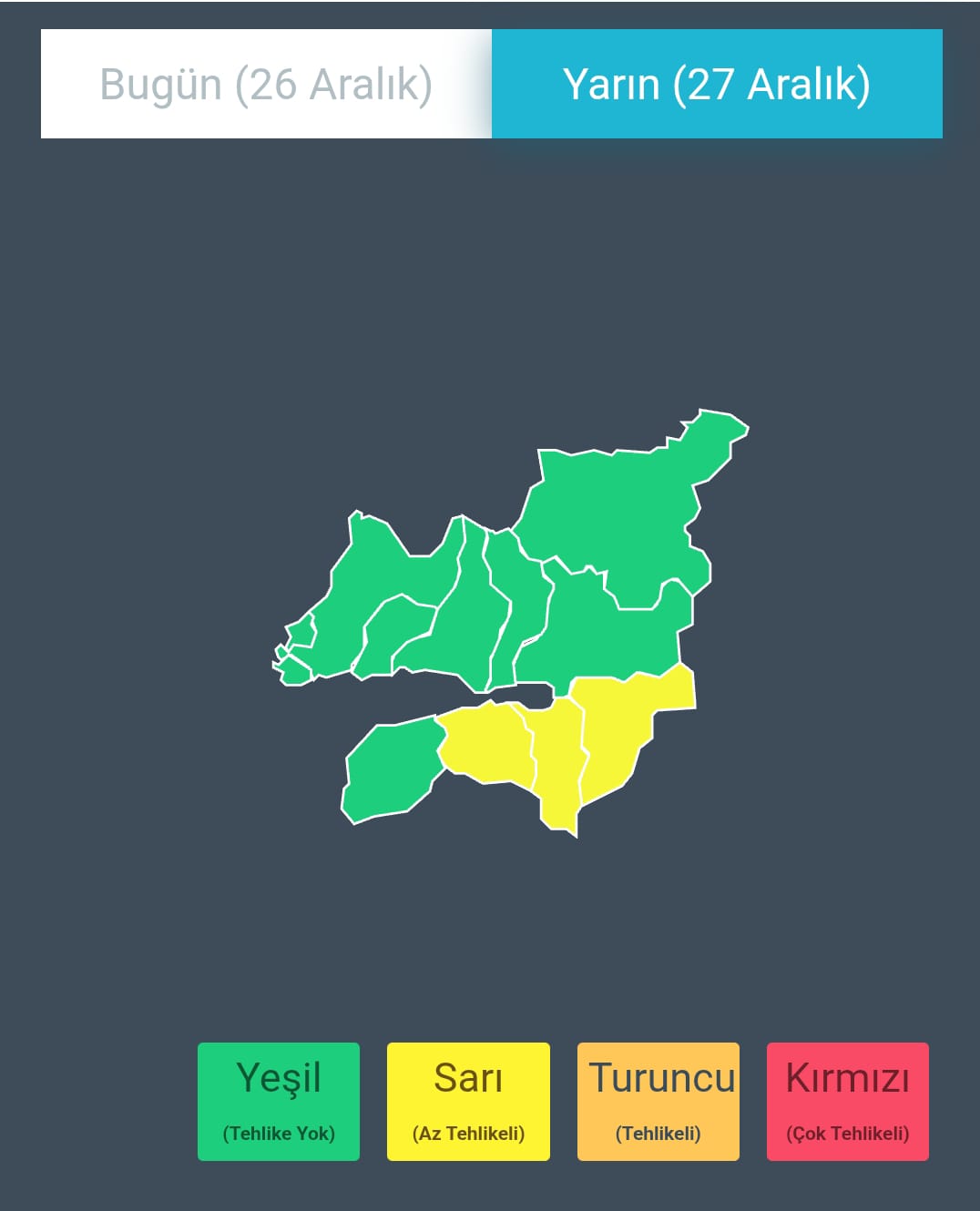 Yapılan son değerlendirmelere göre, 26 Aralık 2025 Cuma günü gece saatlerinden itibaren Kartepe, Başiskele ve Gölcük ilçelerinin yüksek kesimlerinde 5 ila 20 santimetre arasında kar yağışı bekleniyor. Kar yağışının Cumartesi akşam saatlerinde etkisini kaybetmesi öngörülüyor.