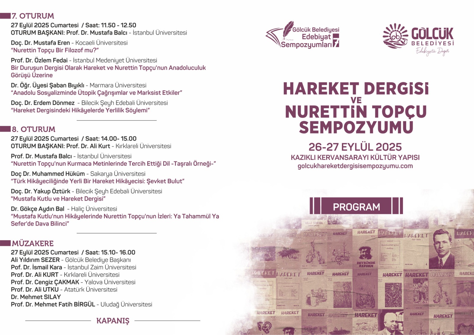 Gölcük Belediyesi edebiyat sempozyumları serisinin 7.’si olacak olan "Hareket Dergisi ve Nurettin Topçu Sempozyumu" 26 Eylül Cuma günü, Kültür ve Turizm eski Bakanı, AK Parti MKYK Üyesi Mahir Ünal’ın katılımıyla Kervansaray’da başlayacak.