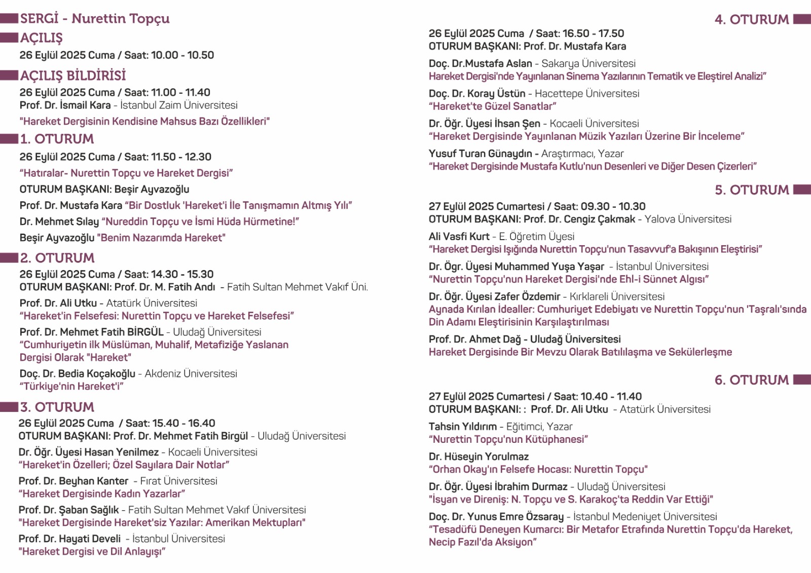 Gölcük Belediye Başkanı Ali Yıldırım Sezer'in açılış konuşmasıyla başlayacak olan sempozyumda akademisyenler, yazarlar ve araştırmacılar, ünlü düşünür Nurettin Topçu ve onun kurucusu olduğu Hareket Dergisi'ni farklı yönleriyle ele alan bildiriler sunacak.