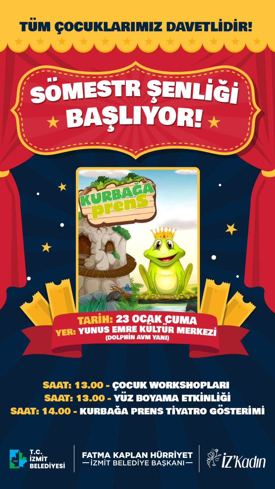 İzmit Belediyesi, yarıyıl tatiline giren çocuklar için eğlence ve öğrenmeyi bir araya getiren ücretsiz bir etkinlik programı hazırladı. Sömestr dönemine özel olarak planlanan şenlikte tiyatro gösterisi, atölye çalışmaları ve yüz boyama etkinlikleri çocuklarla buluşacak.