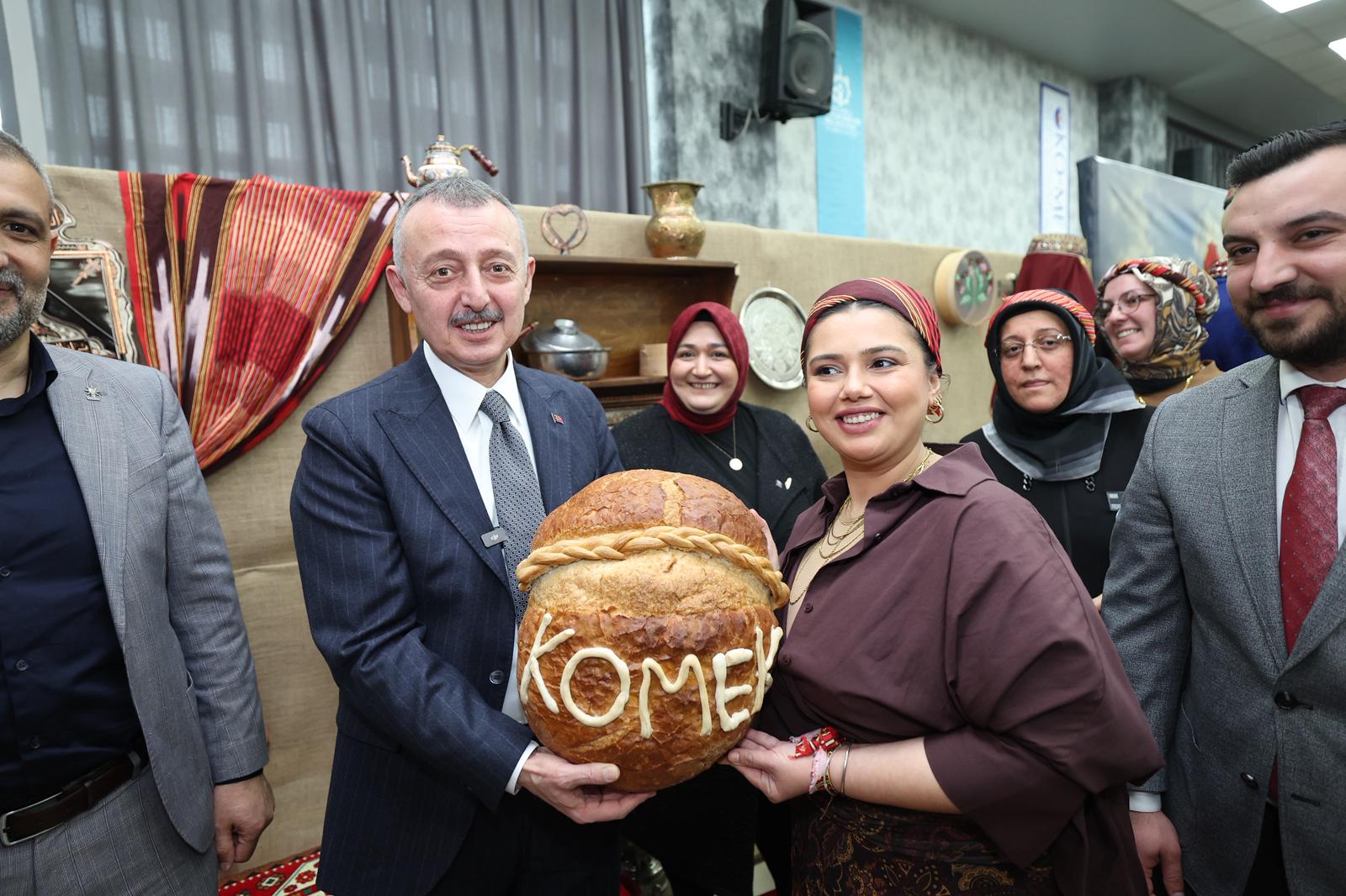 Konuşmalardan sonra geleneksel KO-MEK bohçası yakında düğünü olacak nişanlı bir kursiyere hediye edildi. Başkan Büyükakın, serginin açılış kurdelesini kursiyerler ve çocuklar ile birlikte kesti. Açılışın ardından tüm stantları gezerek, el emeği göz nuru ürünleri inceledi. Başkan Büyükakın kültürümüzü sanatla buluşturup geleceğe taşıyan tüm usta öğretici ve kursiyerleri yürekten kutladığını belirtti.