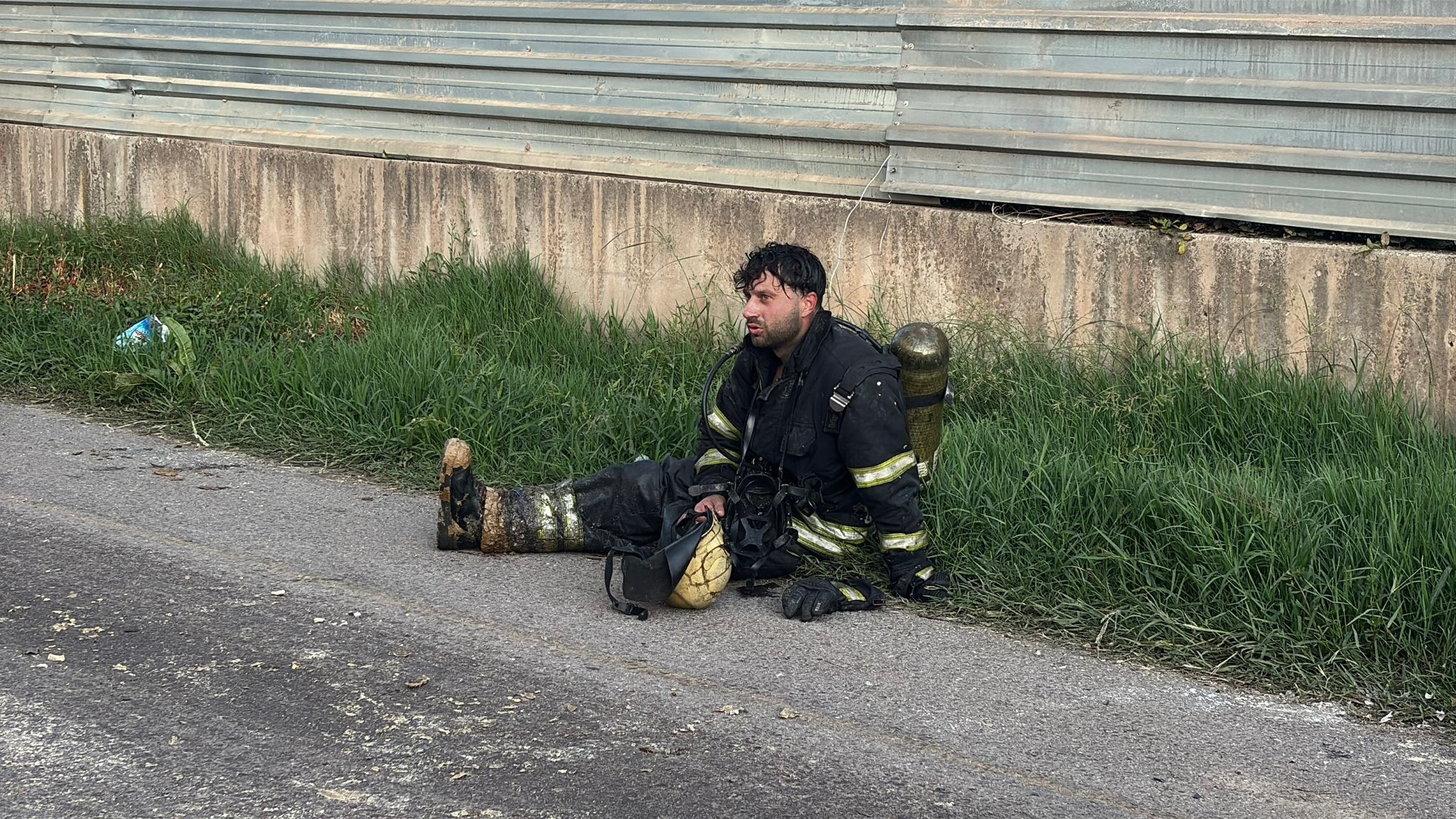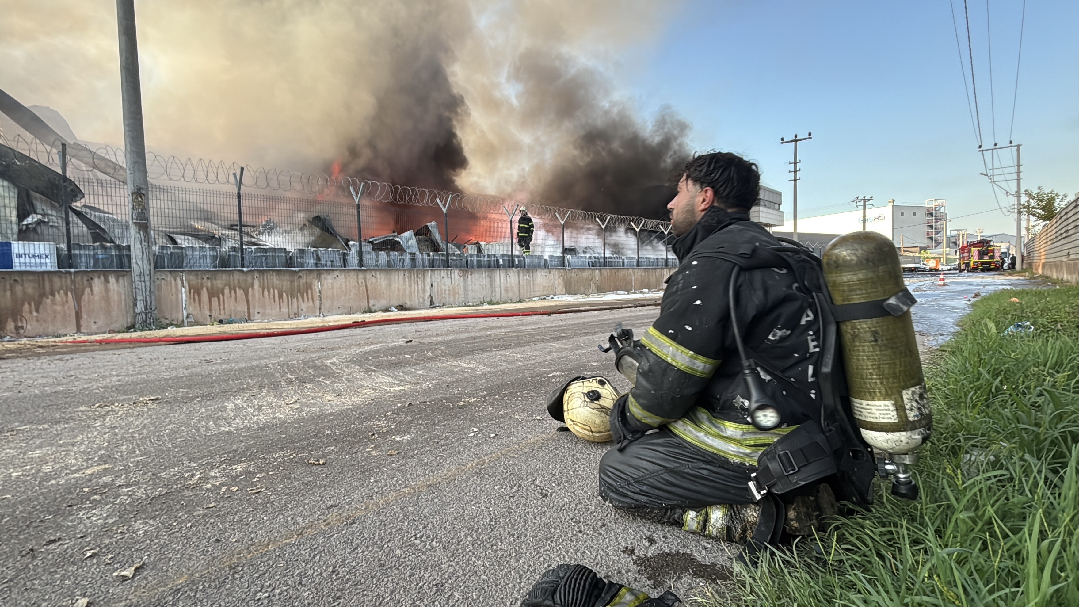 Yangın söndürme çalışmaları sırasında yorulan bazı itfaiye erlerinin, alevlerin karşısında dinlenirken verdikleri mola, mücadelenin zorluğunu gözler önüne serdi.