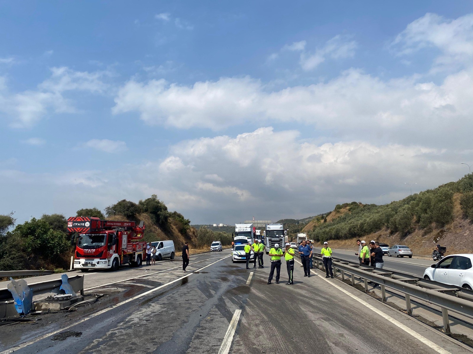 İtfaiye ekipleri tankerde soğutma çalışması yaparken, yaralı sürücü A.D. sağlık ekiplerinin müdahalesinin ardından hastaneye sevk edildi. Ortalığın adeta savaş alanına döndüğü kazada, yol her iki istikamete de kısa süreli trafiğe kapandı. Yola ise yağ döküldü. Kara yolları ekiplerinin dökülen yağı temizlemesinin ardından yol kontrollü olarak tekrar trafiğe açıldı.